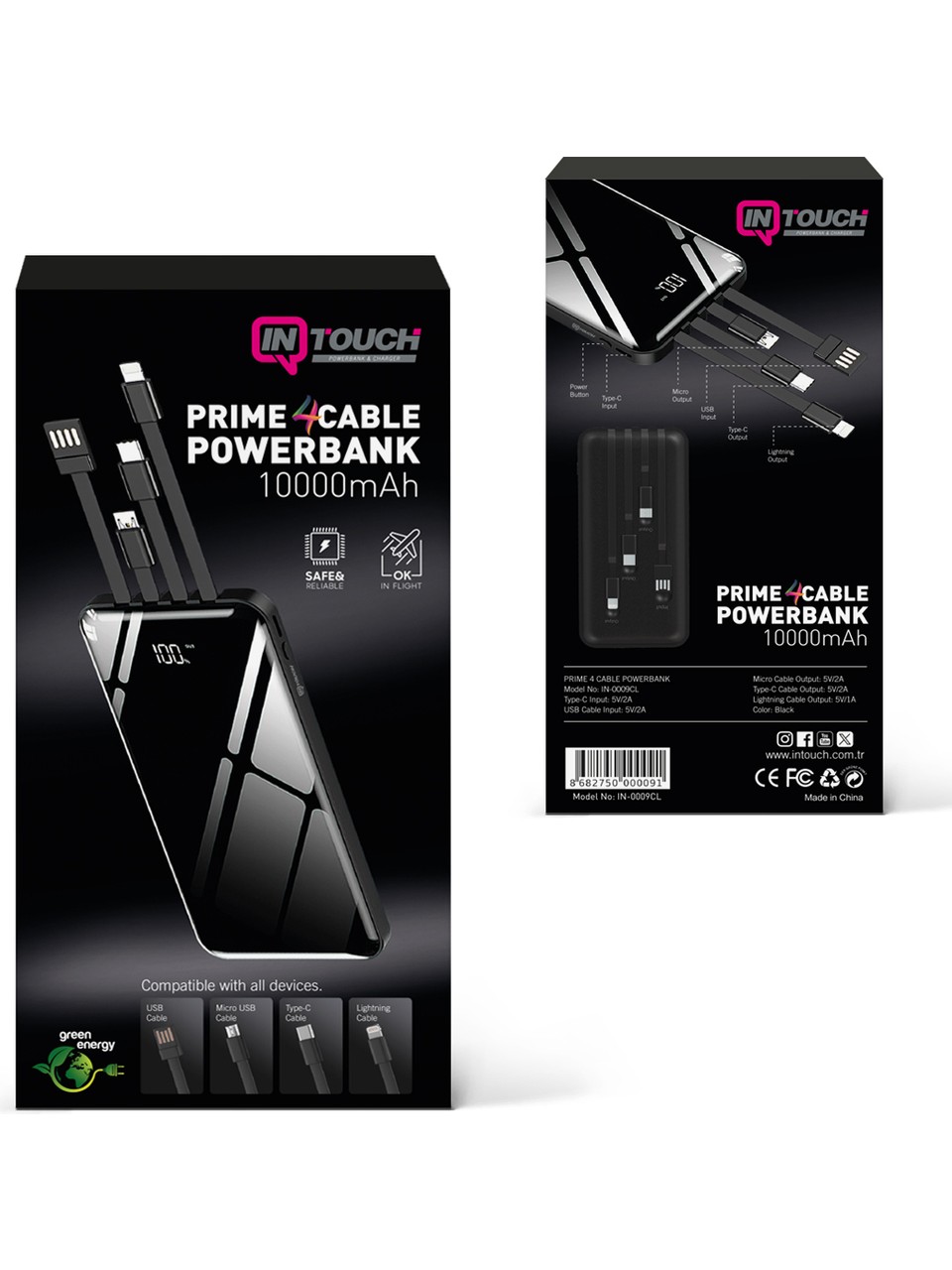Intouch 10.000 mAh Prime Dijital Göstergeli Dahili Çoklu Kablolu Powerbank hareket halindeyken mobil ürünlerini kaliteli bir şarj aleti ile şarj etmek isteyen kullanıcıların ihtiyaçlarına hitap ediyor. Taşınabilirlik ve mini tasarım özelliklerini birlikte sunan ürünümüz özel tasarımı sayesinde daha kolay kavranabiliyor.