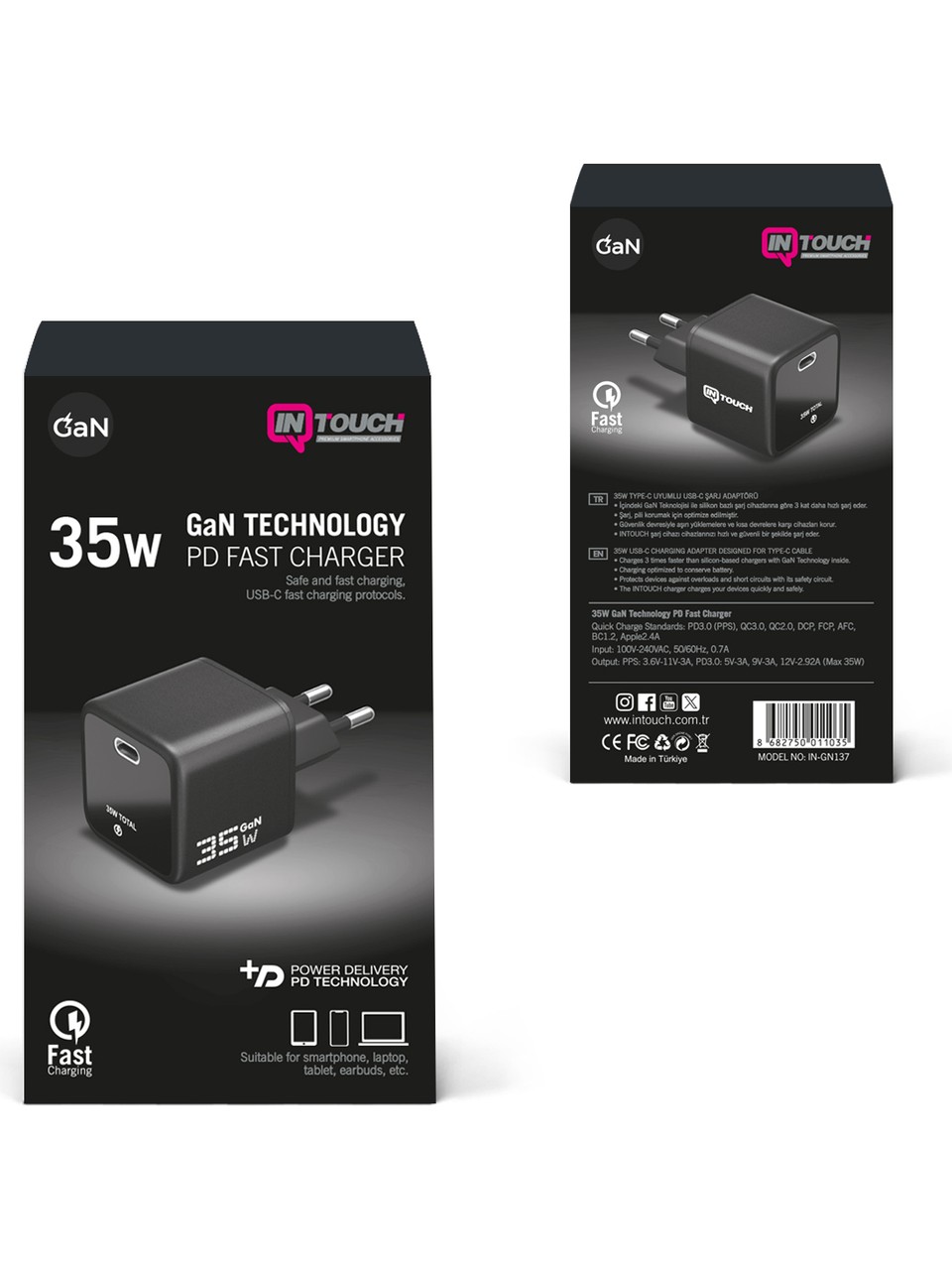 GaN teknolojisi ile ultra kompakt, 35W güç çıkışı tablet ve telefonlarınızı şarj eder.